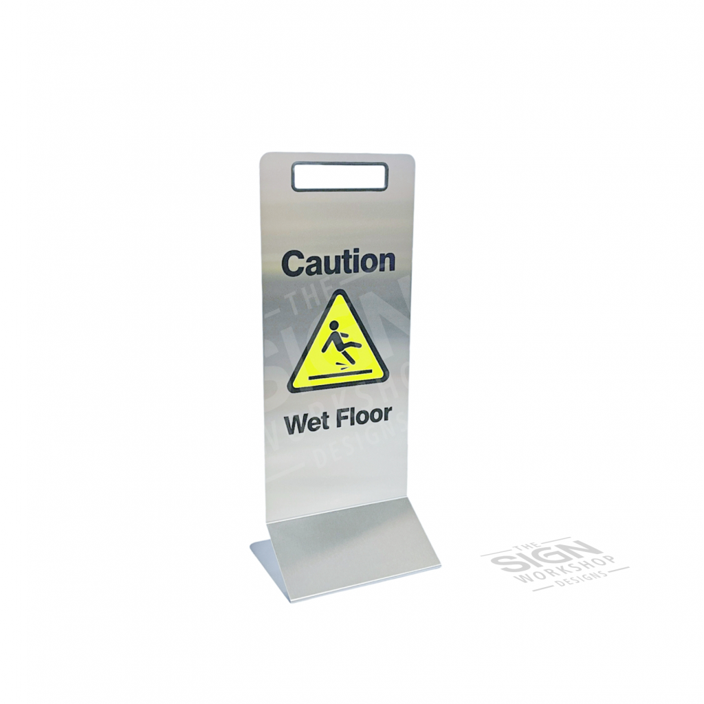 Designed and manufactured from our workshop in Surrey under Certificate of registration design no. 6041678 awarded from the Intellectual Property Office (IPO) our unique and stylish floor signs in high quality Stainless Steel Signs, size 750mm x 290mm, come with a rubber surround handle and protective feet.